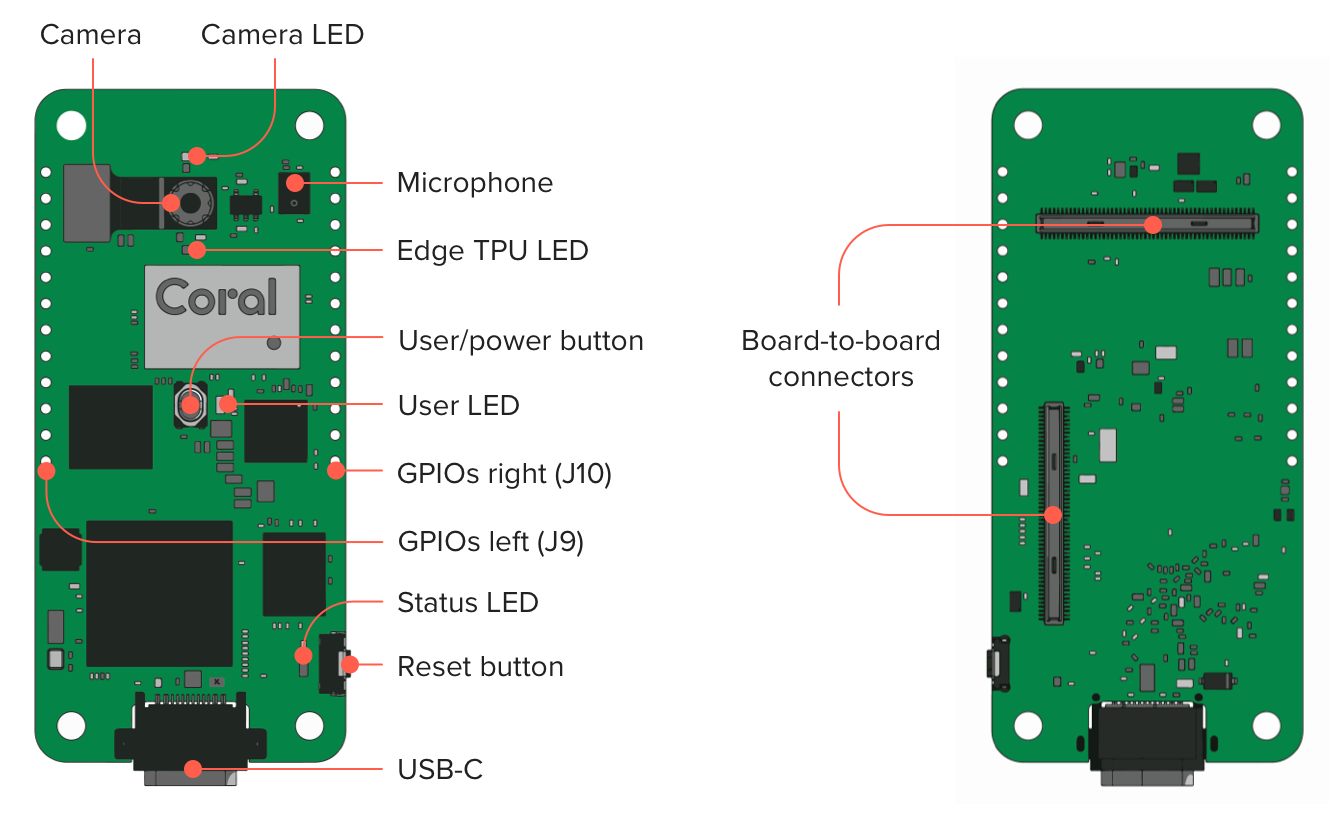 - Board-to-board connectors for add-on boards such as the Coral Wireless Add-on and PoE Add-on