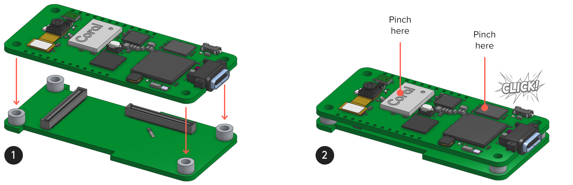 Orient the boards to align the board-to-board connectors and mounting holes.