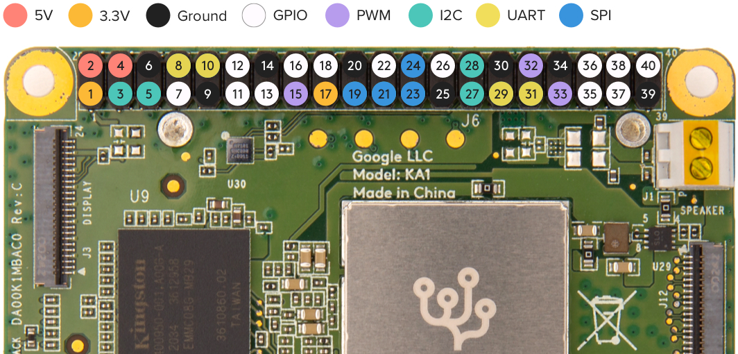 The Dev Board Mini provides access to several peripheral interfaces through the 40-pin expansion header, including GPIO, I2C, UART, and SPI. This page describes how you can interact with devices connected to these pins.