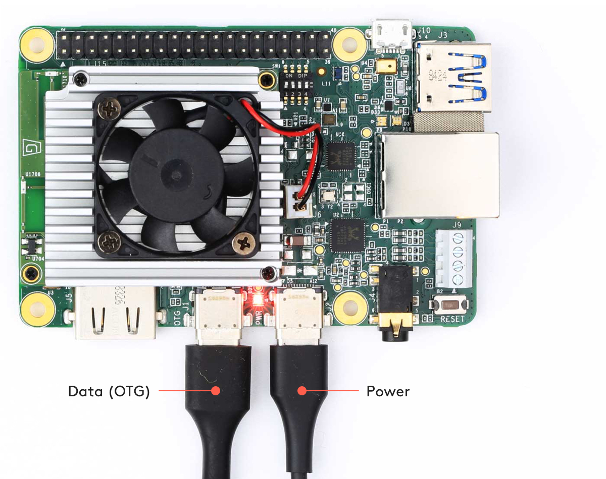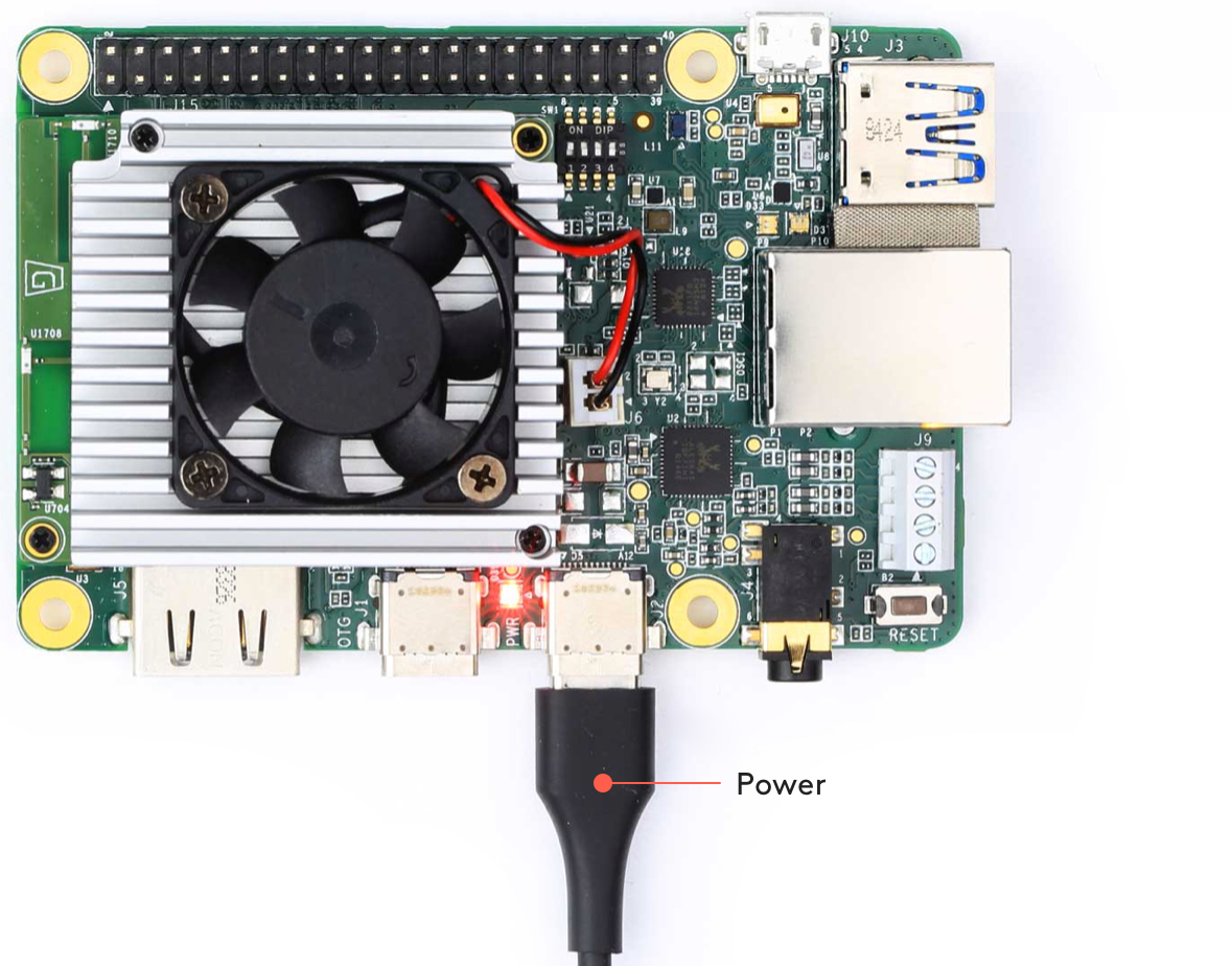 Power up the board by connecting your 2-3 A power cable to the USB-C port labeled "PWR" (see figure 3). The board's red LED should turn on.