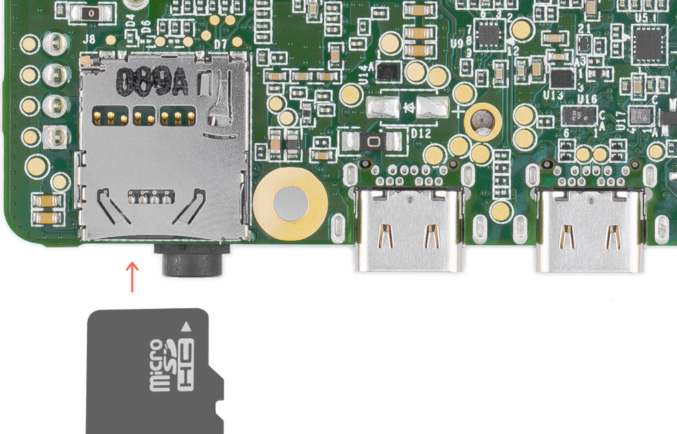 To simplify the flashing process, we created a runtime system that runs on a microSD card and flashes the board with the Mendel system image. Unlike other boards like Raspberry Pi, Mendel Linux does not run on the microSD card—we only use the microSD card to install the operating system on the built-in flash memory—you'll remove the microSD card at the end of this process. (If you don't have a microSD card, you can instead manually flash the board over USB.)