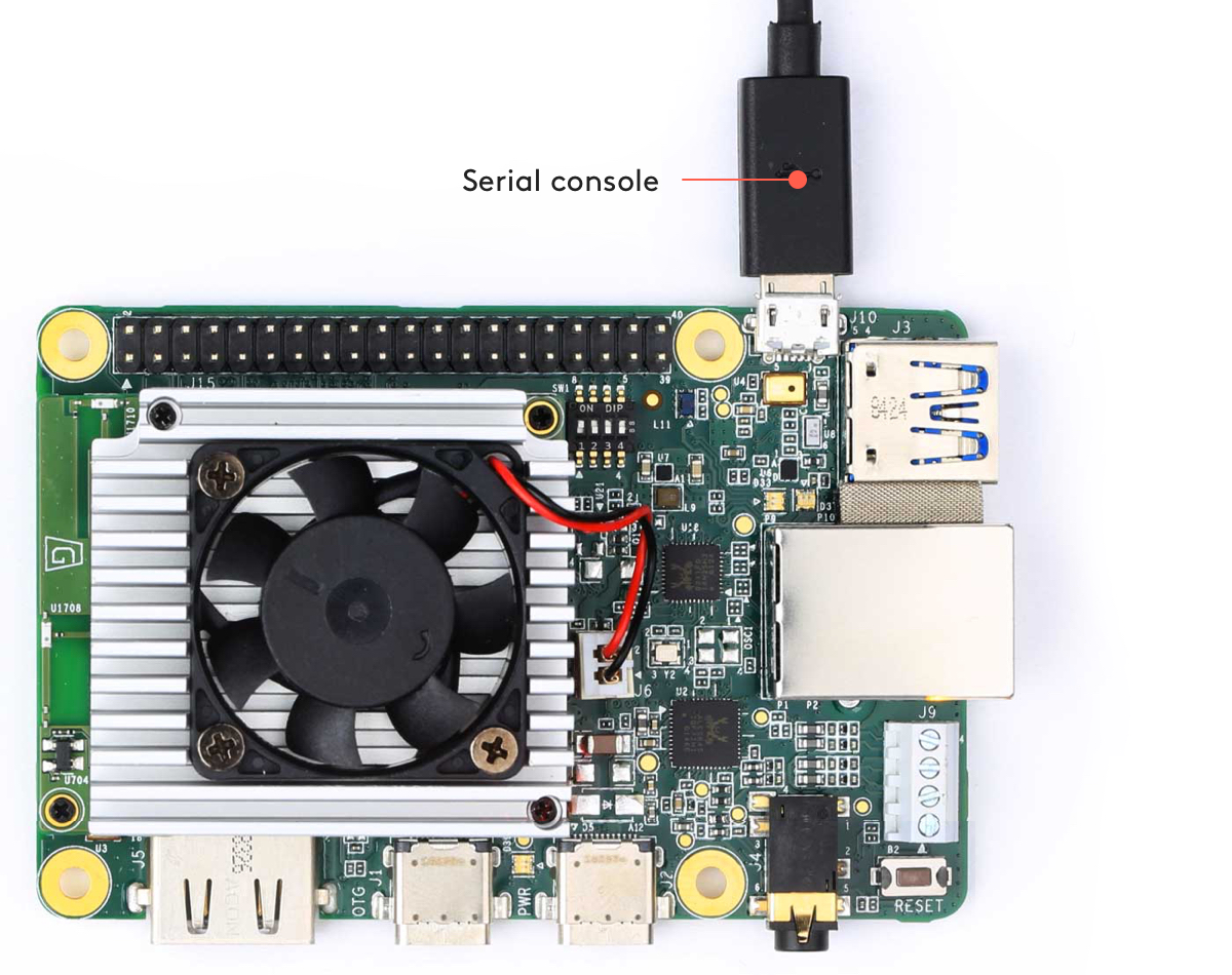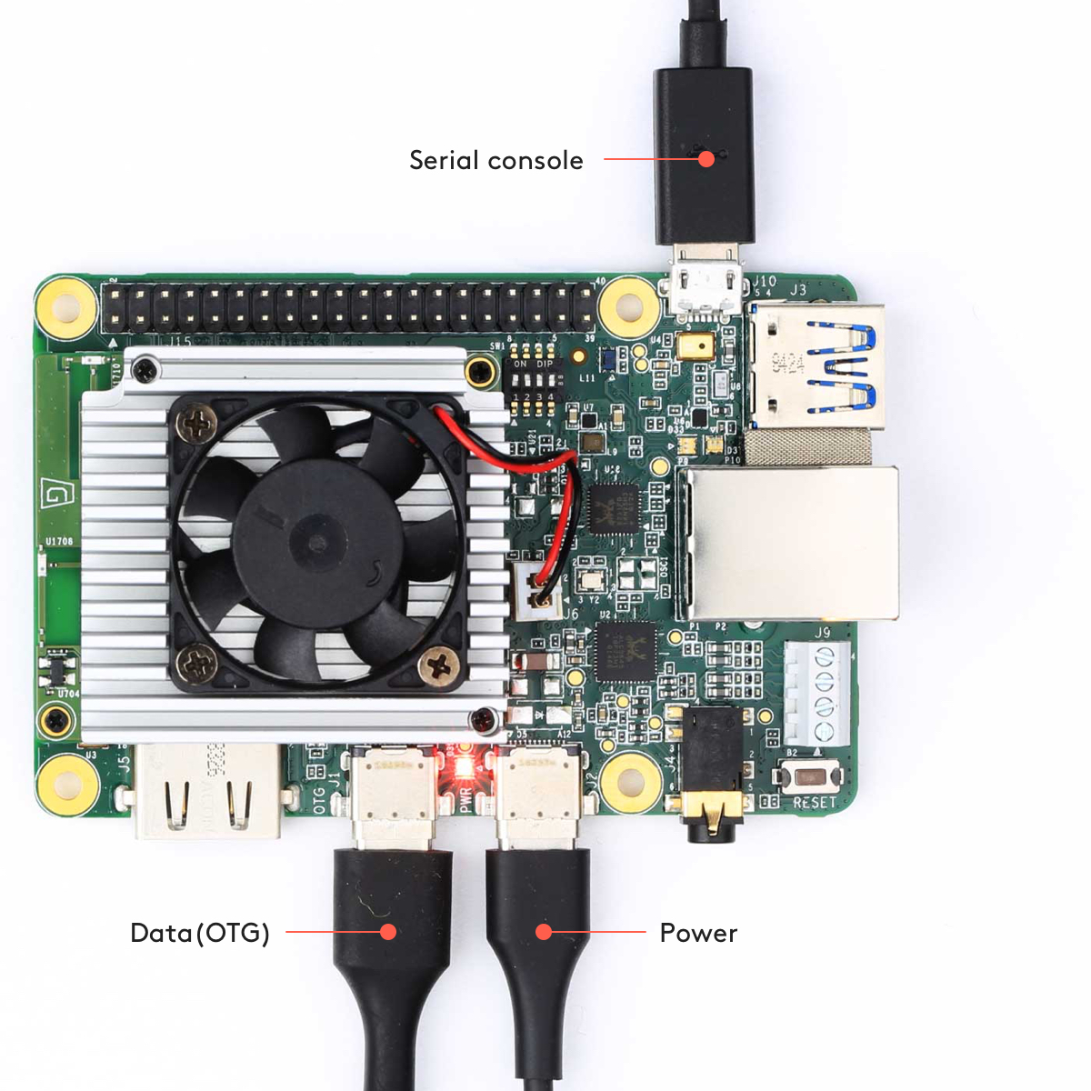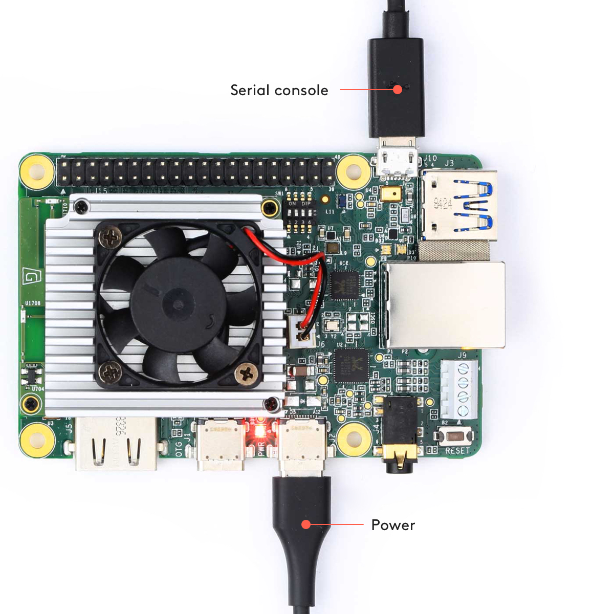 Caution: Do not attempt to power the board by connecting it to your computer.Figure 10. A USB-C power cable connected to the board (in addition to the serial cable) The board's red LED will illuminate and the fan might turn on.