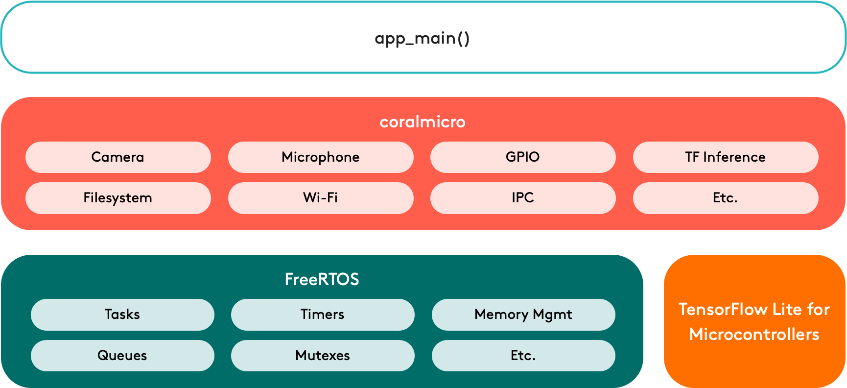 You also must use certain APIs from the coralmicro library to delegate model operations to the Edge TPU, similar to the Edge TPU Runtime used with other systems above. We also recommend FreeRTOS for task scheduling and other real-time programming features.