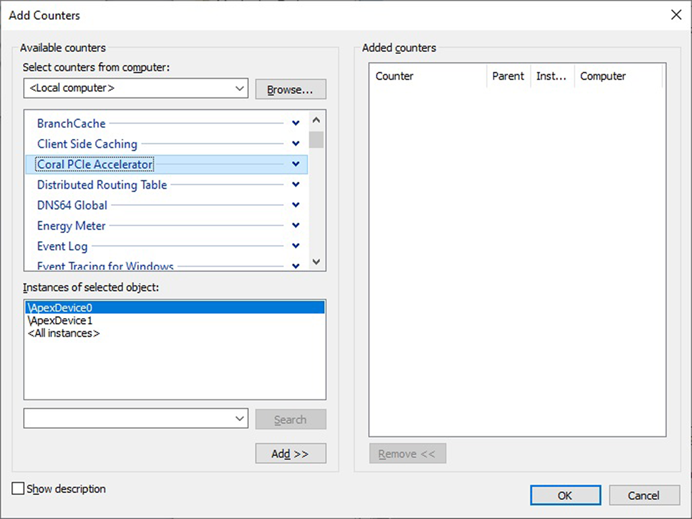In the Add Counters dialog, select the Coral PCIe Accelerator counter, select which instances you want to view, and then click OK.