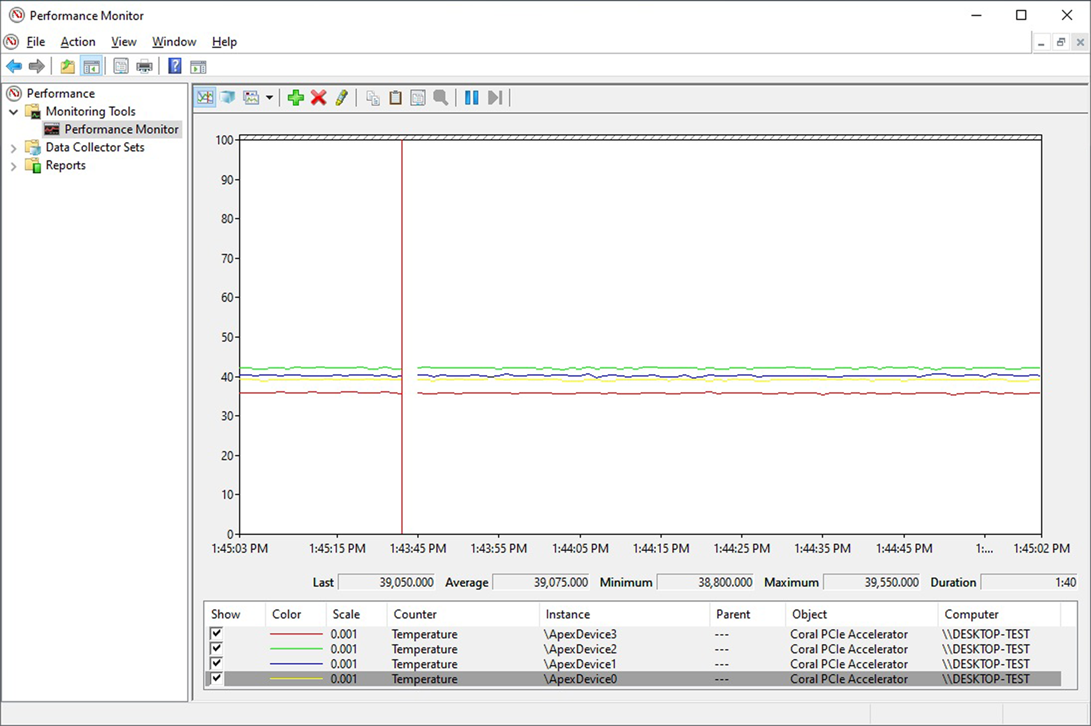 Figure 3. The temperature for multiple Edge TPUs in Performance Monitor