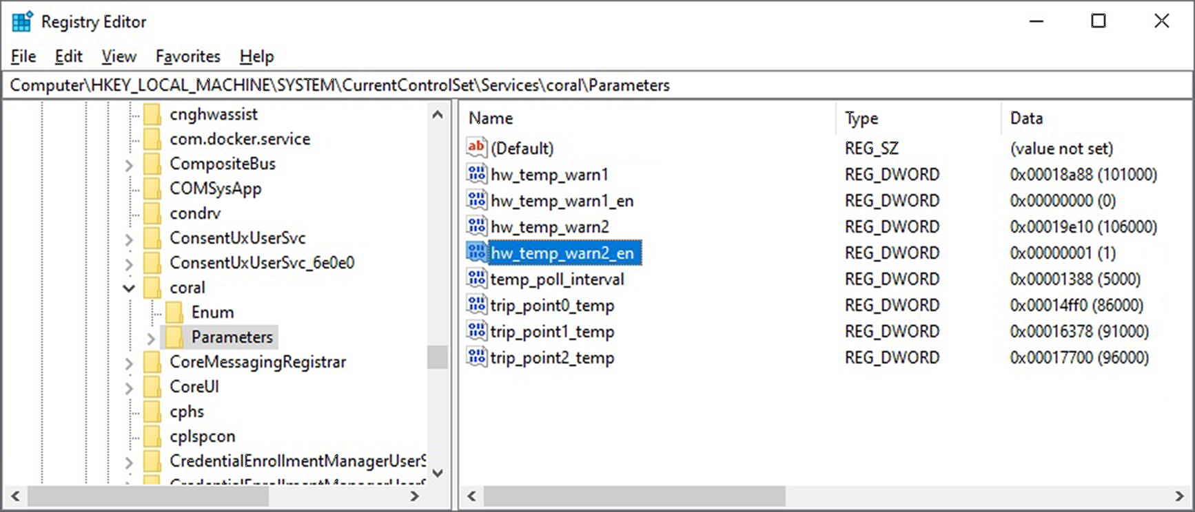 Figure 1. Coral PCIe parameters in Registry Editor -